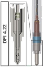 В электромагнитных форсунках DFI 4.22 и DFI 4.25 увеличен надигольчатый объём, диаметр распылителя стал больше а толщина самой иглы стала меньше. Что позволило игле быстрее открыватся, уменьшить сопротивления топлива и колебательные волны в момент многочисленных предвпрысков.