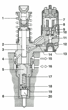 1 - пружина; 2 - корпус насоса; 3 - плунжер насоса; 4 - головка цилиндра; 5 - держатель пружины; 6 - стяжная гайка; 7 - статор; 8 - якорная пластина; 9 - игла соленоидного клапана; .10- стяжная гайка соленоидного клапана; 11 - заглушка канала высокого давления; 12 - заглушка канала низкого давления; 13 - упор иглы соленоида; 14 - сужение; 15 - возврат топлива; 16 - подача топлива; 17 - инжектор; 18 - нажимной штифт: 19 - прокладка; 20 – распылитель