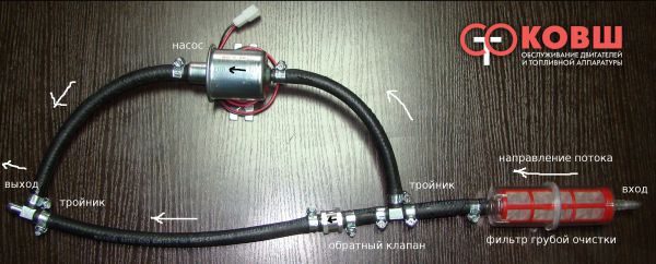 Комплект предназначен для создания, параллельный топливной линии, которая позволяет проходить топливу в случае выхода топливного насоса из строя. Обратный клапан предотвращает движение топлива по кругу «насос-параллельная топливная линия», а фильтр грубой очистки предохраняет топливный насос от загрязнения.